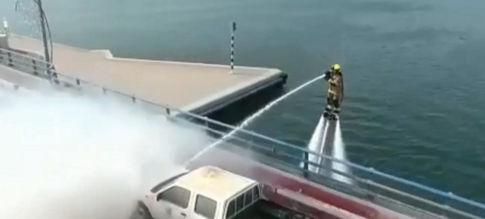 A video posted on Dubai Media Office’s Instagram shows firefighting like you’ve never seen before. The firefighter uses a jet pack to rise above a bridge, by using water pressure from the attached jet ski, before using a fire hose to douse a car which is made to look like it is alight.