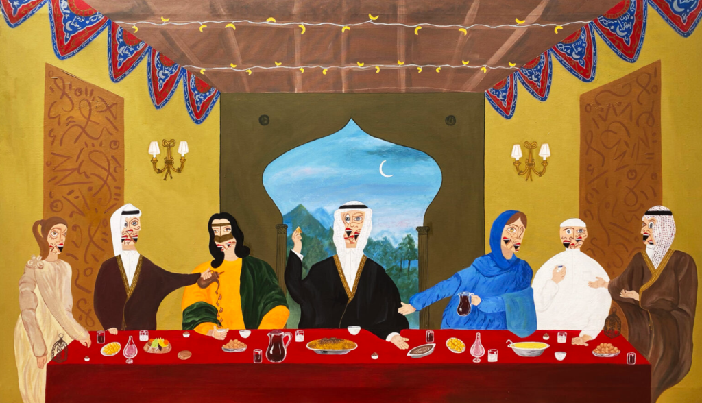 That delicate balance defines his process. “I choose anchors of identity—hospitality, attire, gathering—then fragment secondary details so the viewer reconstructs meaning,” he explains. “It’s a balance of clarity (so it reads ‘Saudi’) and abstraction (so it feels contemporary).”