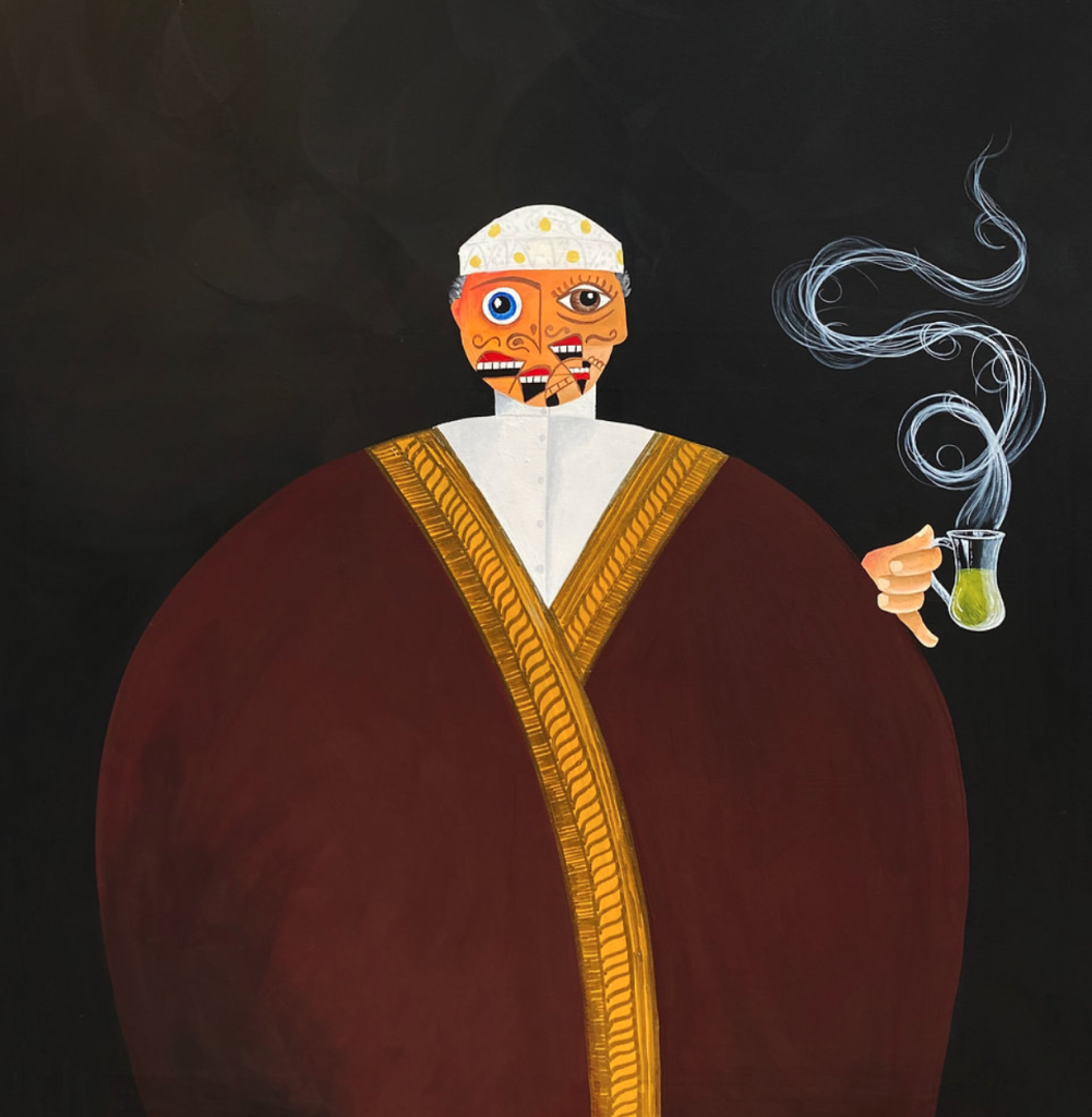 Alkheriji‘s paintings are filled with familiar gestures and cultural codes. “Hospitality and dress are constant,” he explains. “Coffee rituals, gatherings, and traditional garments appear as fractured, recurring shapes. I also pull from vernacular patterns like sadu and details linked to everyday customs.”