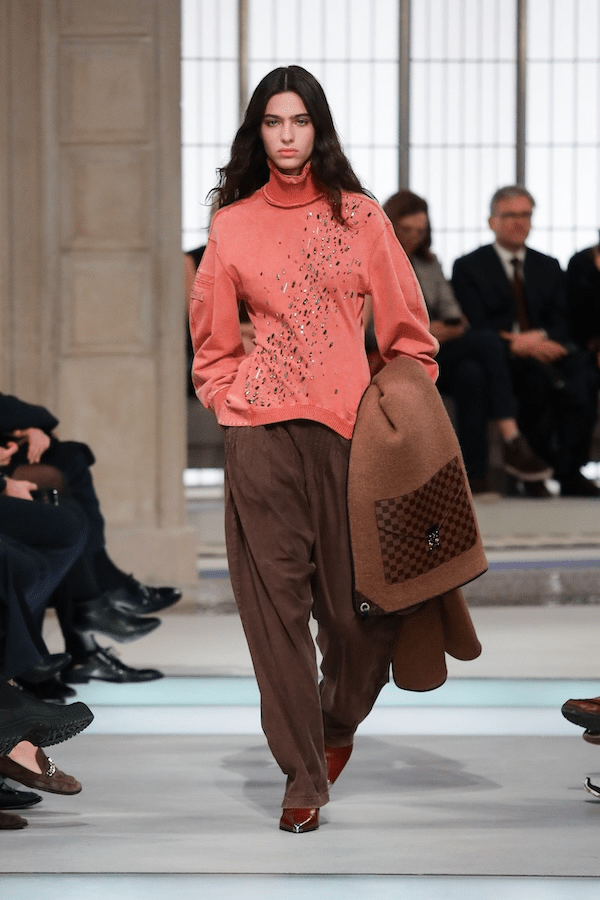 Loli Bahia kept it effortlessly cool at Louis Vuitton, rocking an oversized coral turtleneck with metallic embellishments. The Arab model paired it with high-waisted brown trousers and a coordinating coat featuring a checkerboard-patterned pocket detail—relaxed yet totally polished.