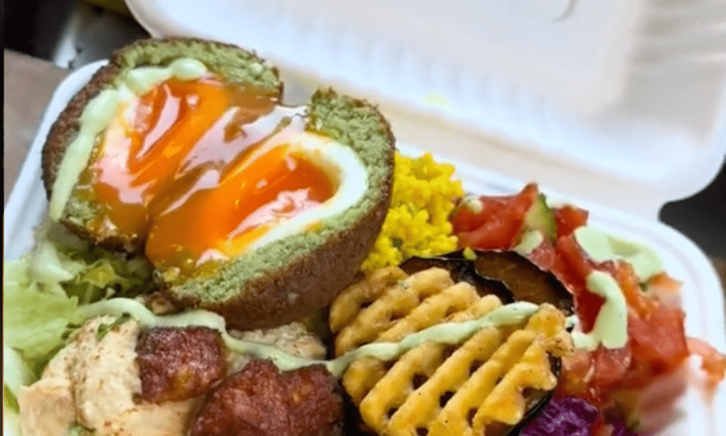 Okay, this one is going to be a little interesting. You know how in the UK they eat Scotch eggs, which are basically boiled eggs wrapped in sausage meat, coated in breadcrumbs, and deep-fried? Well, in London, they decided to take that traditional dish and turn it over its head.