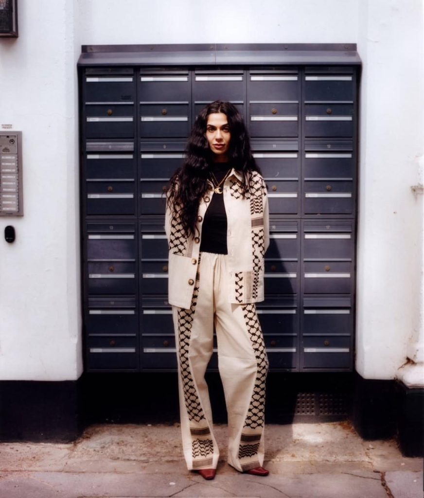 Founded by Egyptian-Iraqi designer Serag ElMeleigy, the UK-based brand Suez celebrated its cultural roots by incorporating keffiyeh and Egyptian khayamiya fabrics into its designs.