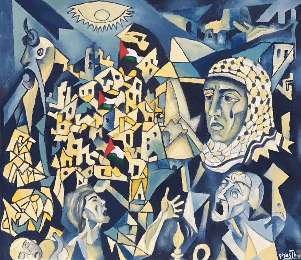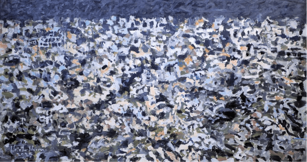 Some of the show’s most haunting images echo universal symbols of war and survival. Firas Thabet’s Gaznica (2025) recasts Picasso’s Guernica, inserting keffiyeh-clad figures and Palestinian flags into the chaos.