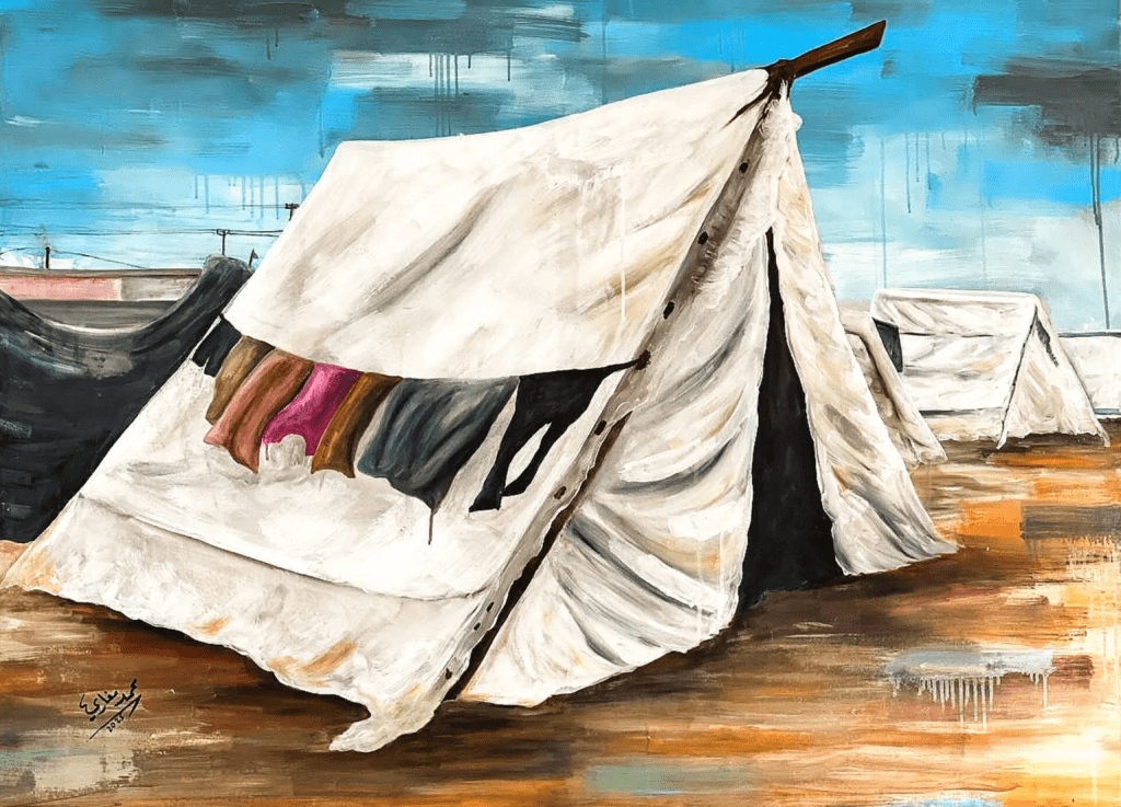 In Mohammed Moghari’s Tent (2025), a fragile shelter becomes both home and symbol, an emblem of millions displaced.