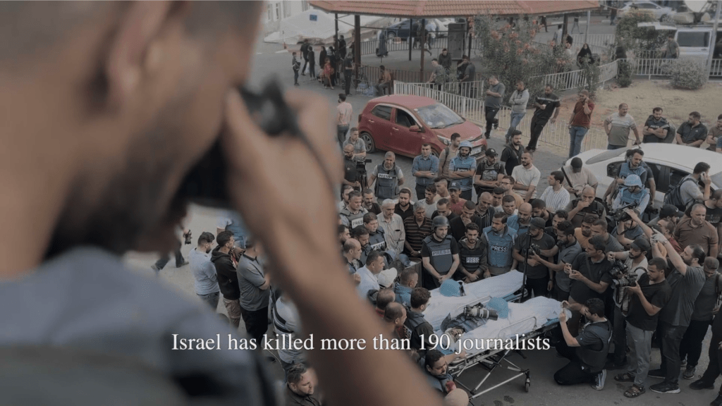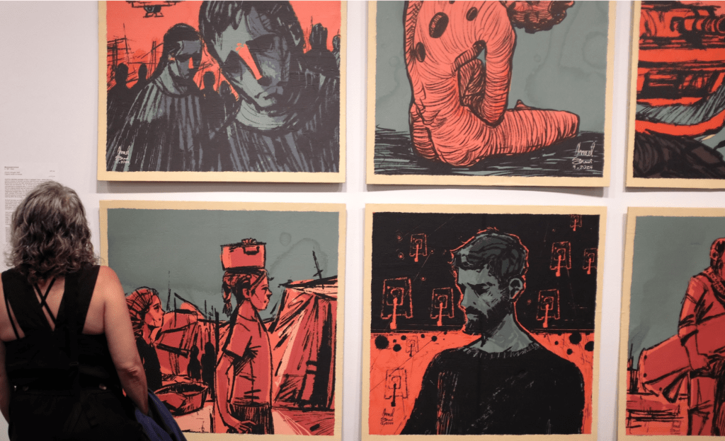 And beyond canvases, Filmmaker Emad Badwan’s Live Broadcast (2024) stages two journalists desperately trying to transmit from a refugee camp, asking into the void: “Can anyone hear us?” The lack of signal becomes a metaphor for silenced voices.