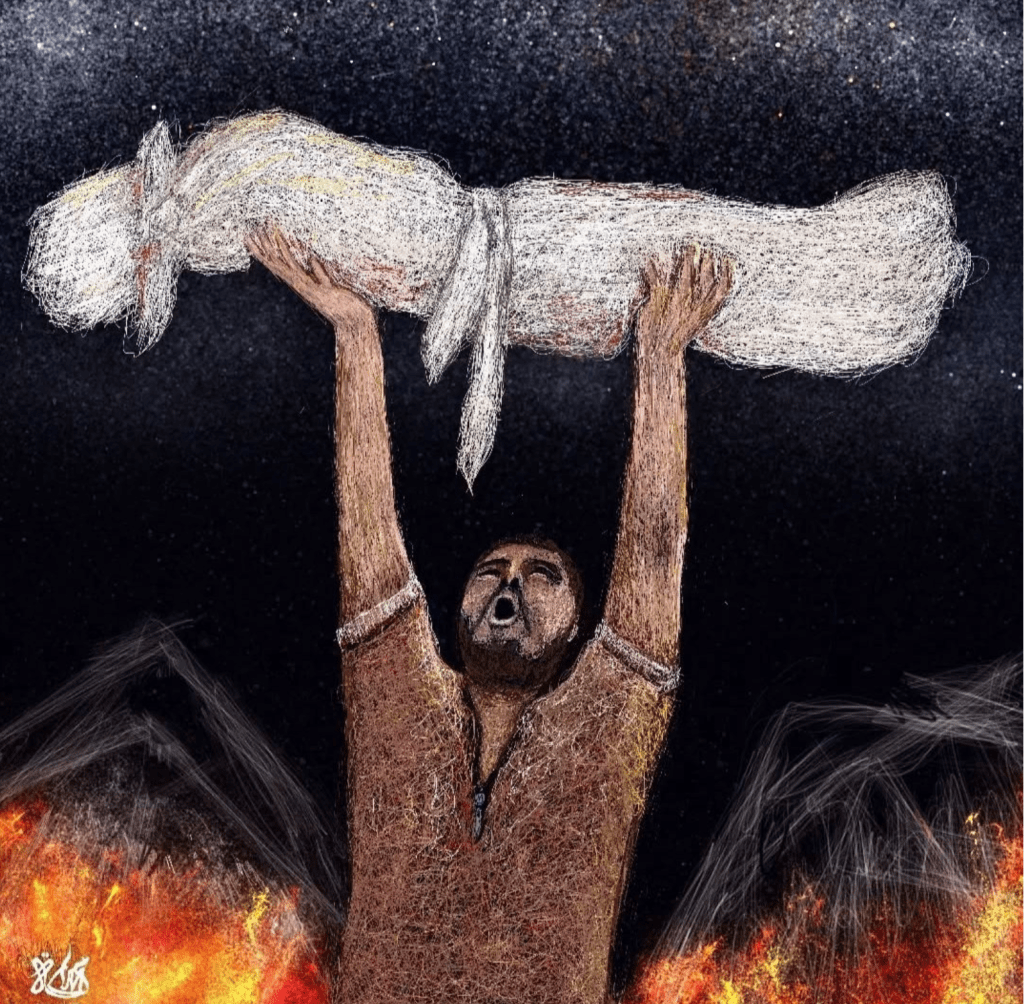 This is exactly embodied in Moataz Naim’s tragic work, which evokes nothing but destruction and ashes.