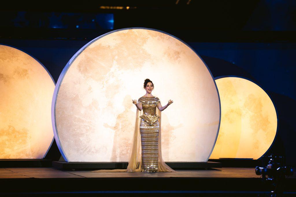 She shares with us a little behind-the-scenes story: she spent more than an hour hidden behind the giant moon onstage—unable to sit, unable to drink water, rehearsing in her tight gold costume. At the last minute, she decided to flare her gold cape while singing, a spontaneous choice that later inspired thousands of fan drawings. Exhausted, cramped, and hidden from view, that small, playful moment ended up becoming one of the most iconic images of the night.