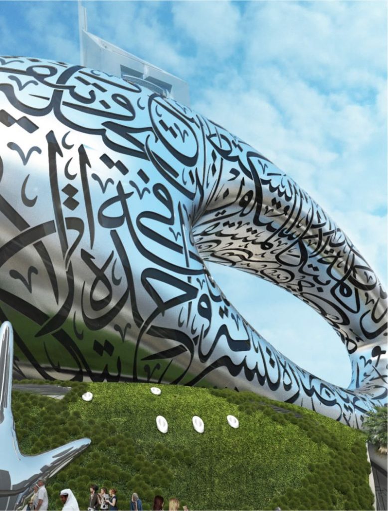 Dubai’s iconic Museum of the Future, adorned with Arabic calligraphy, is expected to open its doors to the public in September 2020. The museum stands as a visionary hub for visitors to experience new innovations and technologies. Although it is currently under construction, the museum’s design has already won awards.