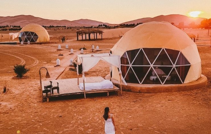At the Sunrise Sahara Campsite, instead of tents, they have famous igloo-shaped small cabins, which have their own running water and bathrooms, along with a traditionally themed interior that mixes both old and new.