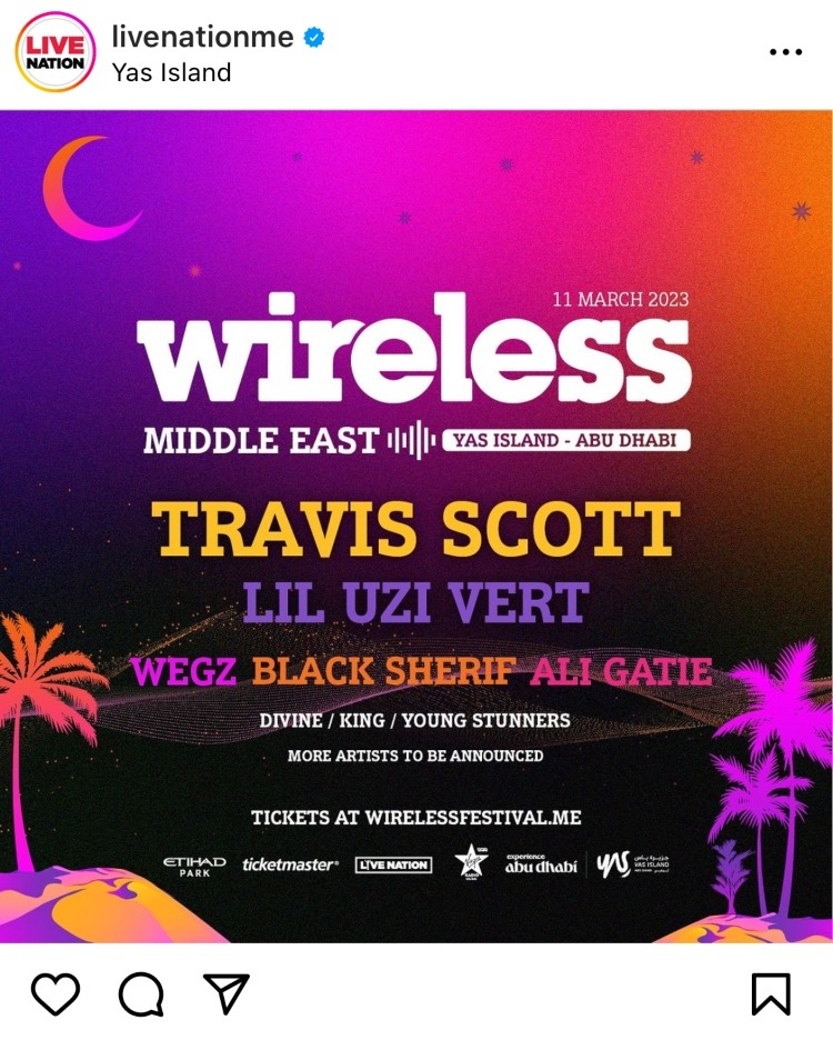 Egyptian rapper Wegz, Lil Uzi Vert, Ghanaian singer and rapper Black Sherif, Divine, King, Young Stunners, Iraqi-Canadian Ali Gatie and singer, songwriter and rapper Travis Scott will perform on its stage on March 11th. With the festival known to amass more than 50,000 fans, on that day, everyone will be flocking to Yas Island for the star-studded show set along multiple stages.