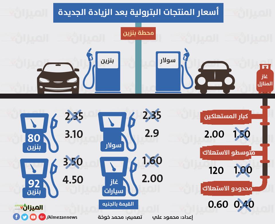 According to the info-graph; the 92 fuel is set to increase from 3.5 LE to 4.5 LE, the 80 fuel is set to increase from 2.35 LE to 3.10 LE, the solar is set to increase from 2.35 LE to 2.9 LE, and the car gas is set to increase from 1.6 LE to 2.0 LE.