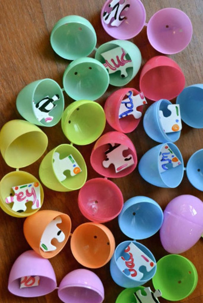 I personally found this game the most creative! It’s where you fill plastic eggs with puzzle pieces with different words written on them, and your kids would have to collect those eggs to put these little pieces together.