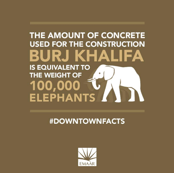 The weight of the concrete used to build Burj Khalifa is equivalent to 100,000 elephants. Yup, you read that right! Oh, and the total weight of aluminum used on Burj Khalifa is equivalent to that of five A380 aircraft