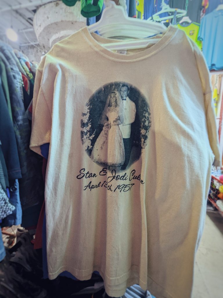 However, amongst the hidden treasures awaiting to be found for those willing to dig deep enough and long enough through the endless racks of clothing, is another curiosity of El Wekala. The custom-printed t-shirts for birthdays, wedding anniversaries, work sports events, and raucous stag and hen parties that happened many years ago in other continents far away are often humorous, inappropriate, and outright bizarre. Asking more questions than they answer, it’s a wonder how many of these hyper specific t-shirts ended up at El Wekala. From their original owners believing them to be worthy of donating, to sellers thinking of the items as suitable to display, to why anyone would buy them, it’s a complete mystery from the face of it. Although not custom made, El Wekala’s large selection of joke t-shirts are also a joy to come across while scouring the racks.