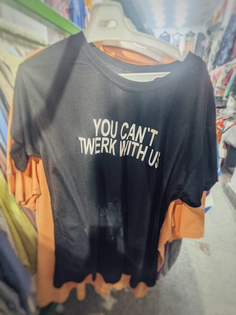 Speaking to a few sellers at El Wekala, they were completely aware of how bizarre and odd many of the t-shirts are and admitted that they only rarely ever sell these t-shirts, often to young Egyptians who ironically can’t resist getting their hands on some of these downright ridiculous t-shirts. They explained to me that as they buy their clothes by weight and in bulk quantities, it’s a complete lucky dip as to what they get. As such, there’s nothing to be lost by putting them on the rack, however slim the chances of finding a customer for them are.