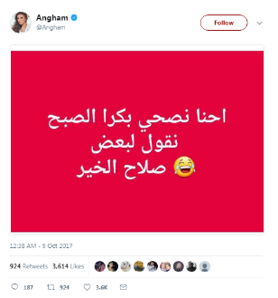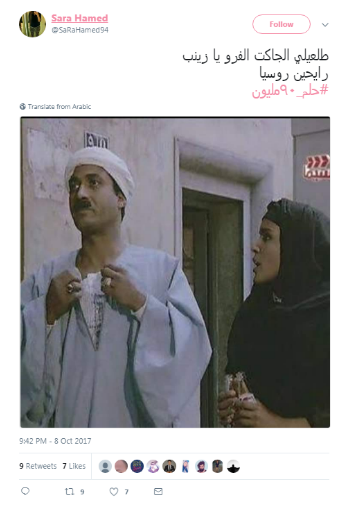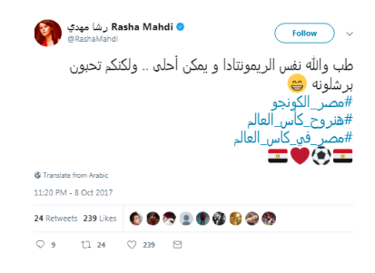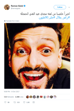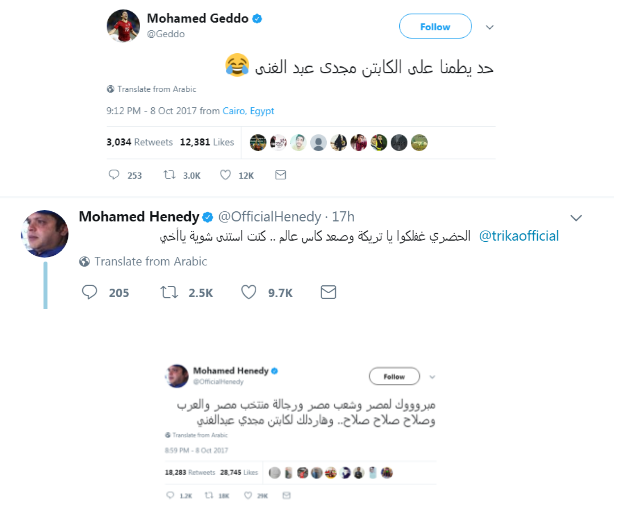 Egyptian celebrities including soccer player Mohamed Geddo, superstar Mohamed Henedy, actor Ramez Galal, singer Angham and actress Rasha Mahdi posted some of the most humorous tweets: