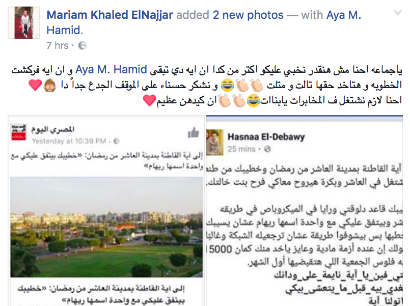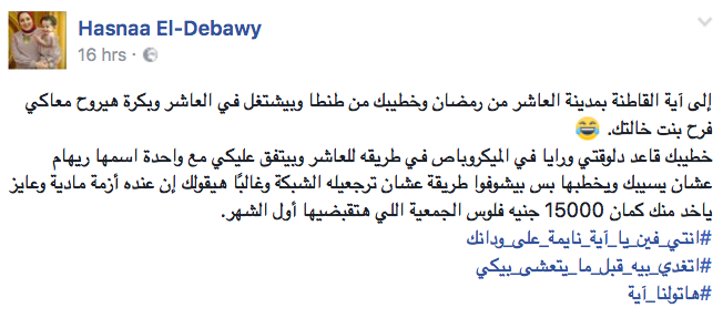 The post warned a girl called Aya from 10th of Ramadan city about her fiance from Tanta. The post was very descriptive. El-Debawy tried as much as she could to help Aya find out about her cheating lover.