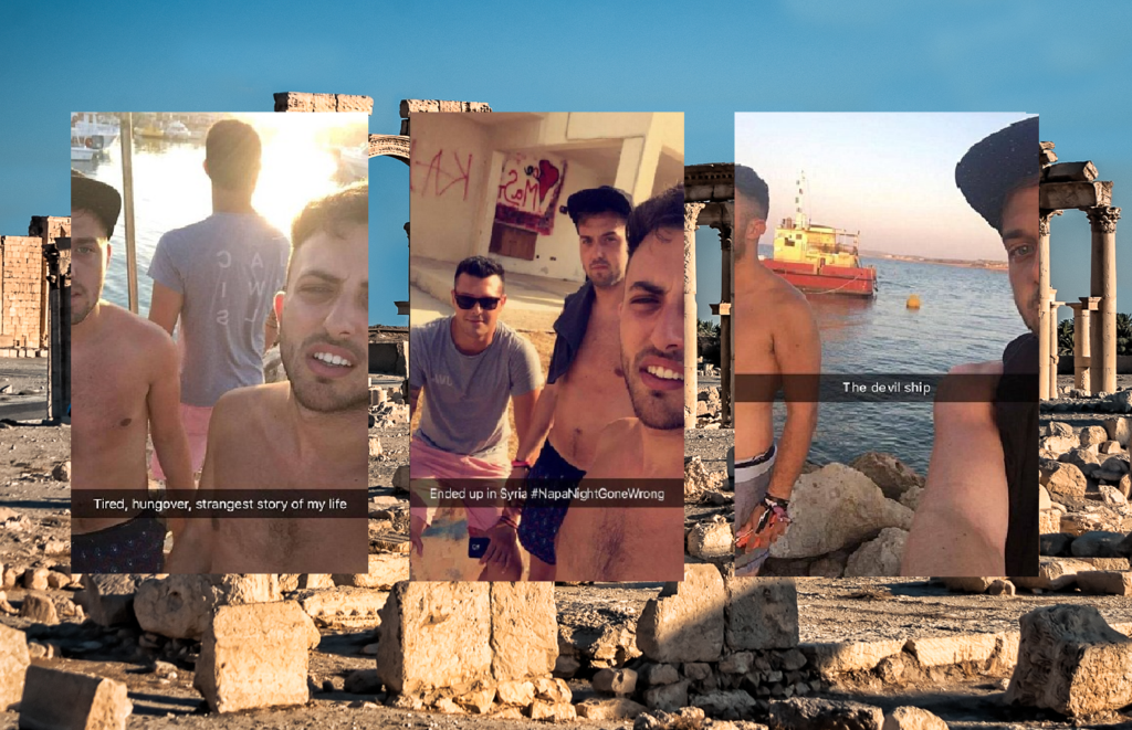 Ellis, who stands out as the leader of the excursion, explained on social media that with the last club closing at 7:30AM, they hopped on the first morning boat and posted the picture above on Snapchat when they found themselves in Syria.