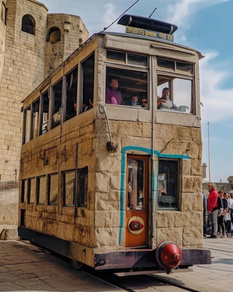 Through Midjourney, Ragab re-imagined Alexandria, replacing the façade of its old buildings into vibrant trams. Using his ingenuity, he also wanted to bring to attention other facets of Alexandria including Qaitbay castle, the picturesque 14th century fortress that protected the city from Ottoman attack. Using AI, he re-imagined the tram as though it is Qaitbay castle itself, designing it with beige brick-laden walls.