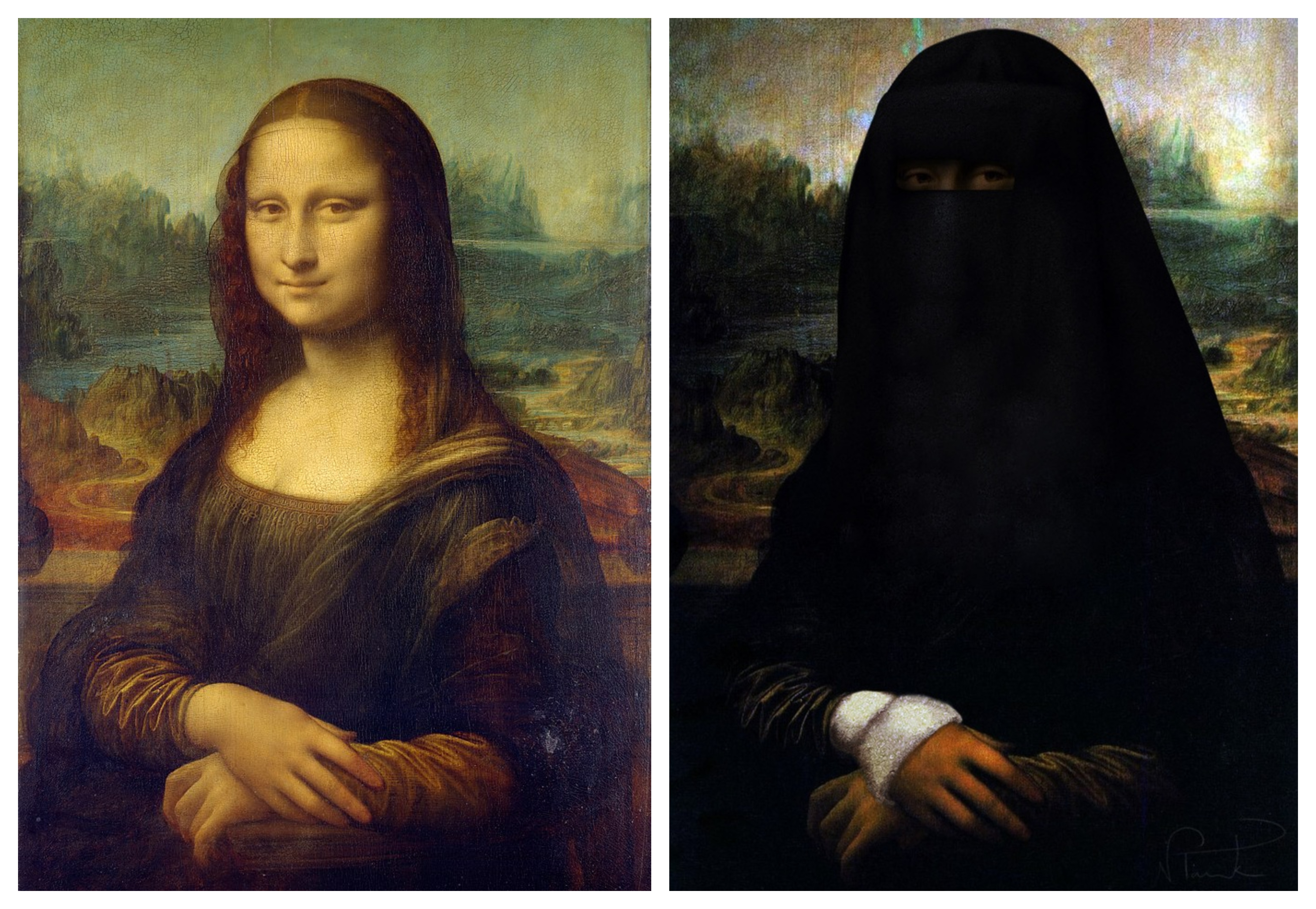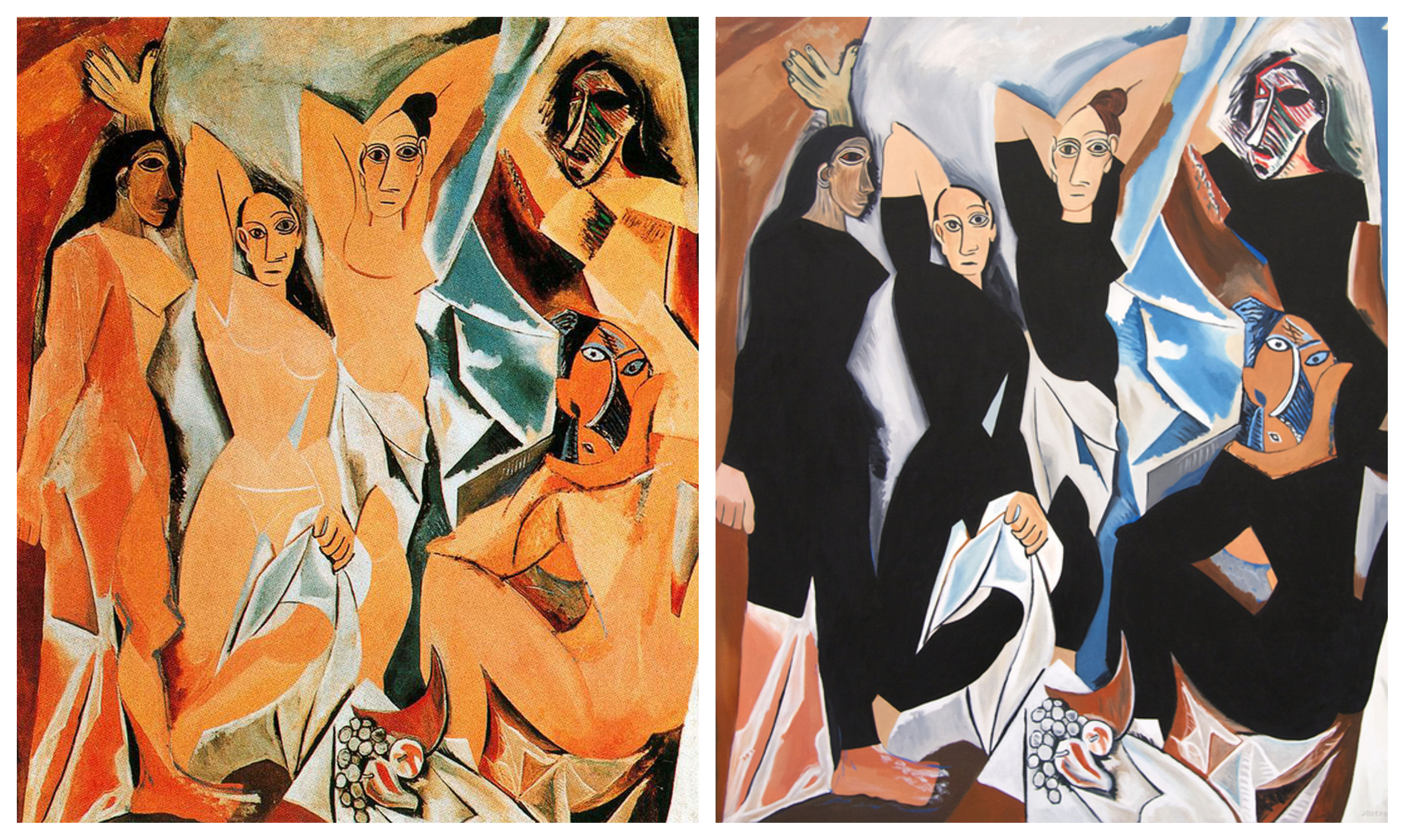 This painting is called Les Demoiselles, it features five naked girls posing gracefully. The Arab version, of course, has them covered up in black paint. The black paint resembles Carina Bodywear that is so famous is the middle east right now that most people use to cover up the parts of their bodies they don’t want to be shown.