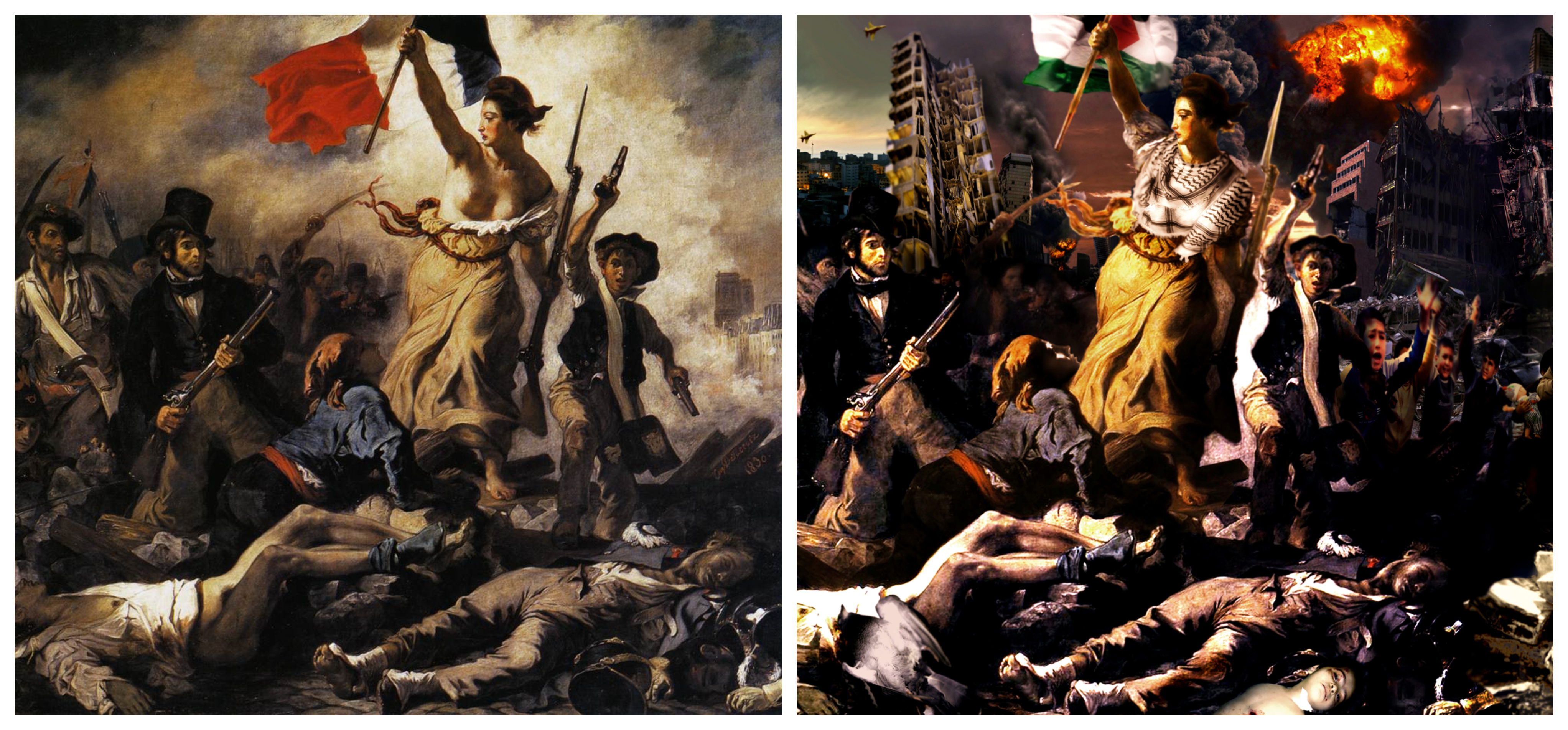 This painting is called Liberty Leading the People and from the first glance you’ll find out it symbolizes the liberation that came with the French revolution, on the other hand, we have the same painting retouched by artist Mohammed Al Hawajri. The Painting shows the pain and the determination of the Palestinians to take back their land.
