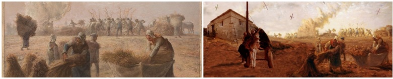 In contrast to the harmony portrayed in the original painting; this painting showcases the restraints that Palestinians face while they are living their lives peacefully. The fighting versus the farming frames the idea perfectly.