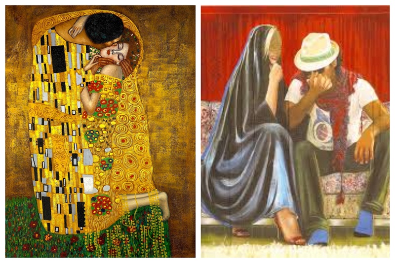 This is the conservative copy of “The Kiss” painting. In the original, you can see the boy kissing the girl’s cheek and you can see her affected by it in a very sensual way. While in the Arab version you’ll find that the guy only kisses the girl’s hand and she smiles back in shyness.