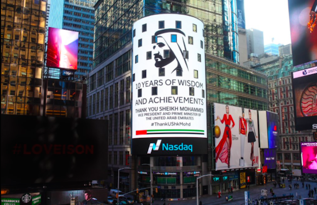One of the most inspirational Arab leaders, Sheikh Mohammed Bin Rashid Al Maktoum, lit up Times Square in New York on the 10th anniversary as UAE Vice President and Prime Minister and ruler of Dubai. The image on Nasdaq tower congratulated the leader on 10 years of wisdom and achievements, ending the message with the hashtag #ThankUShkMohd.