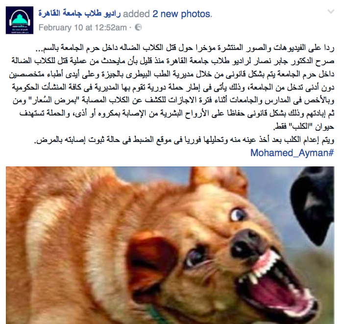 Nassar released a statement via Cusradio Facebook page that the actions taken were legal and under the supervision of Directorate of Veterinary Medicine in Giza. The university aims at locating dogs infected with rabies, to protect the students and citizens.