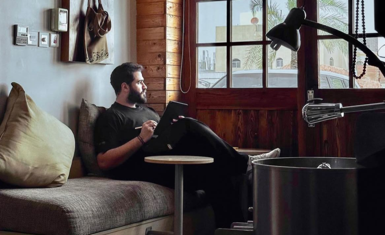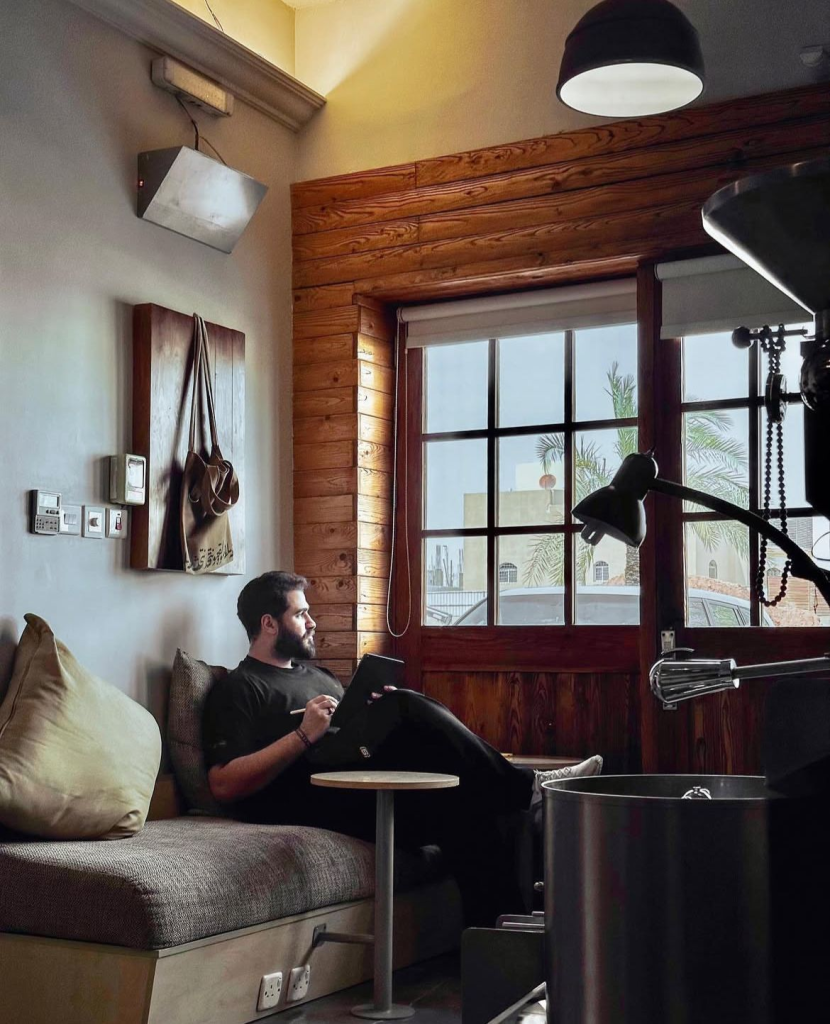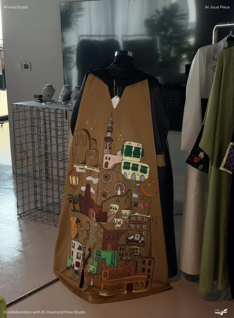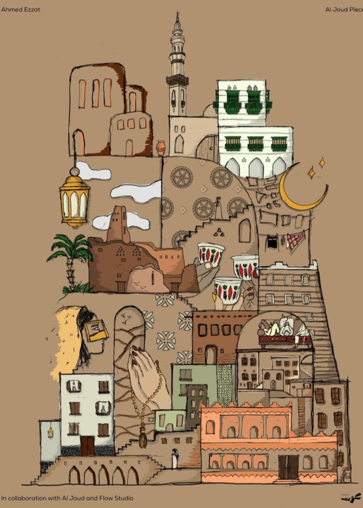 Experimentation and collaboration are central to Ahmed’s process. His recent work with Aljoud Brand and designer Shahad Alwazani brings this to life, merging Saudi architecture and Ramadan traditions into abaya design and illustration.