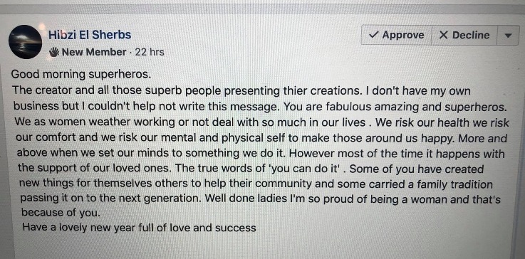 Today, the group includes over 97k members. Atef describes the group as a “full-fledged creative women marketplace”. It includes jewelry-makers, event planners, artists, bakers, and designers, among many others.