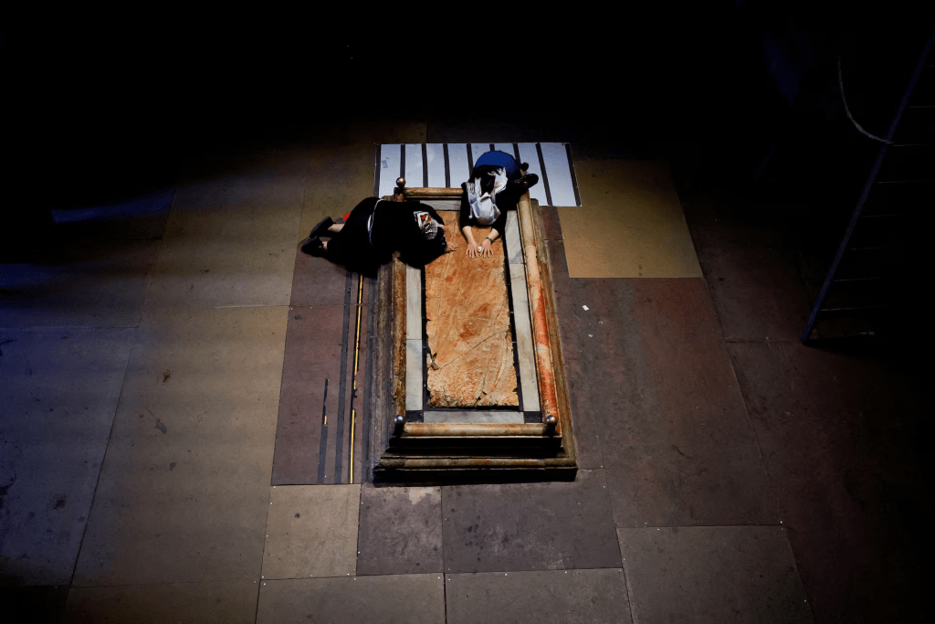 As part of the Washing of the Feet ceremony, worshippers gathered to touch the Stone of Anointing in the very place many believe Jesus’s body was prepared for burial. The atmosphere was hushed, heavy with history, grief, and grace.