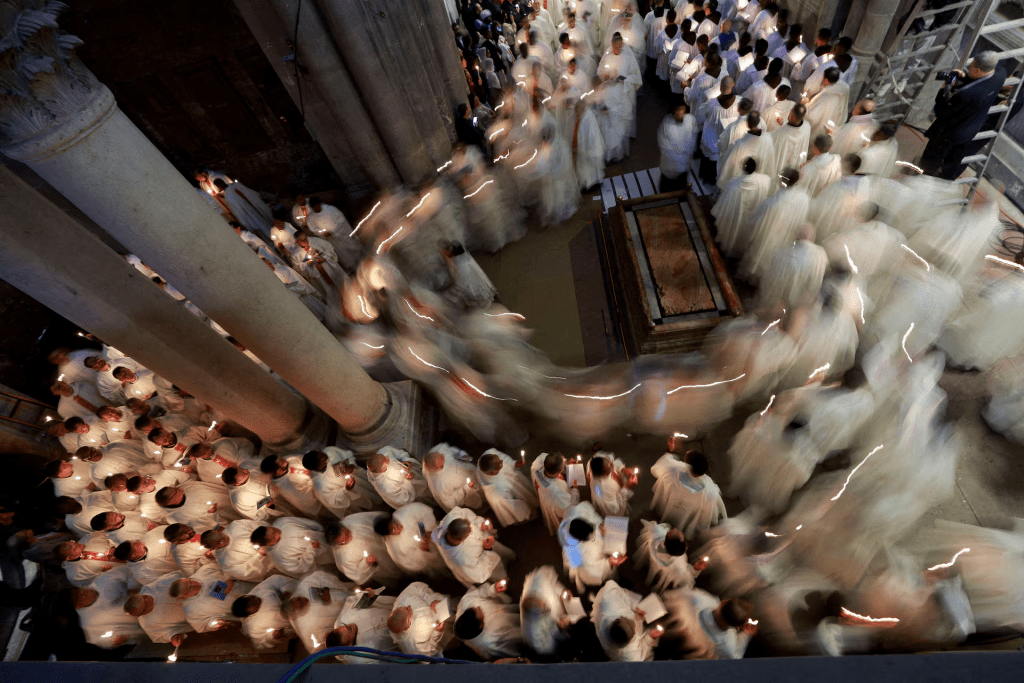 A Greek Orthodox nun takes part in the Palm Sunday procession at the Church of the Holy Sepulchre, a quiet, powerful moment of faith in one of Christianity’s holiest sites.