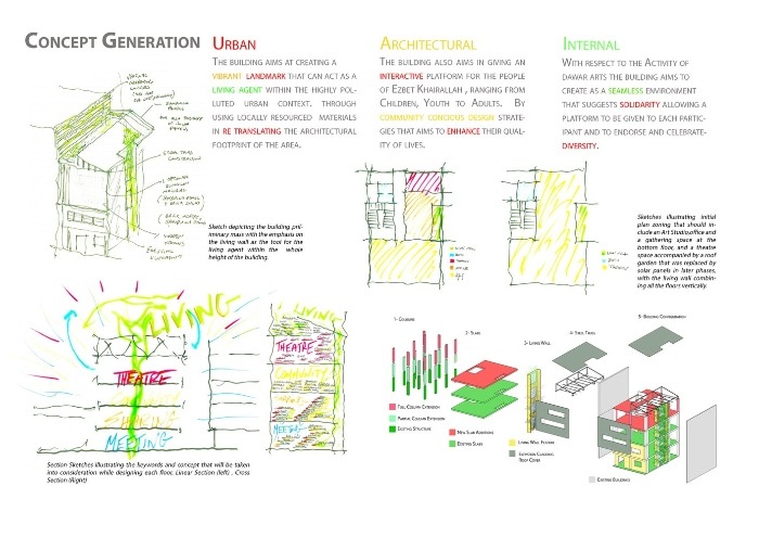 Designed by Ahmed Hossam Saafan, the center offers employment and vocational training for women, and provides an interactive platform for community arts and social interaction for children and adults, all the while encouraging diversity. Operated by Dawar for Arts and Development, an independent cultural organization, the center consists of a theatre/workshop area, an art studio, a gathering space, and an office.