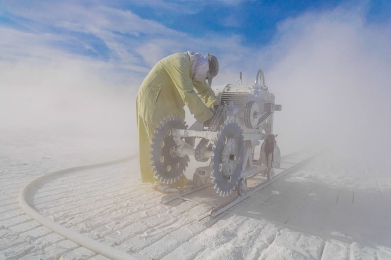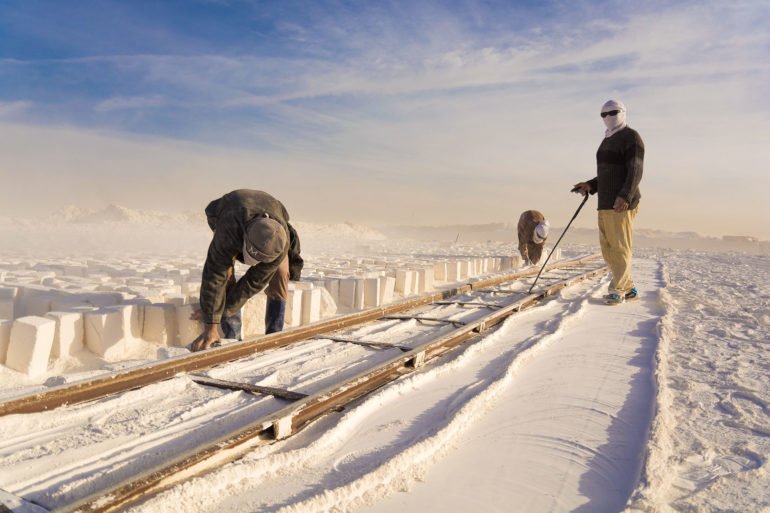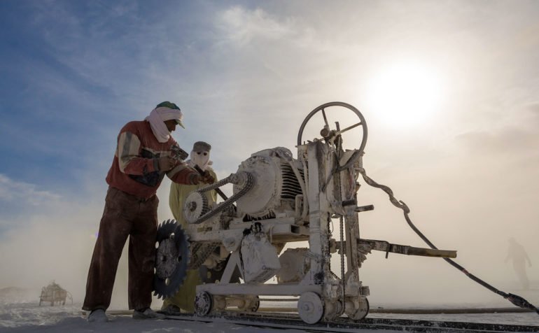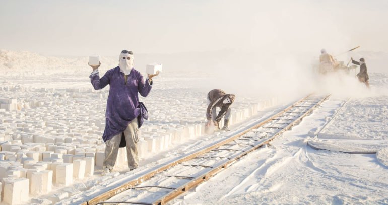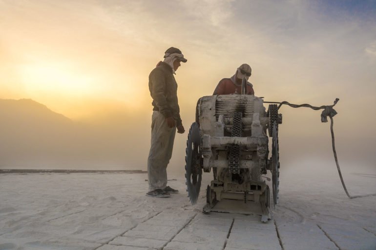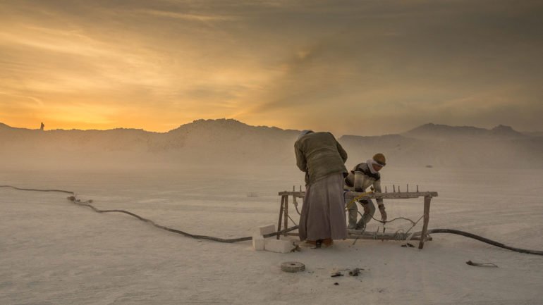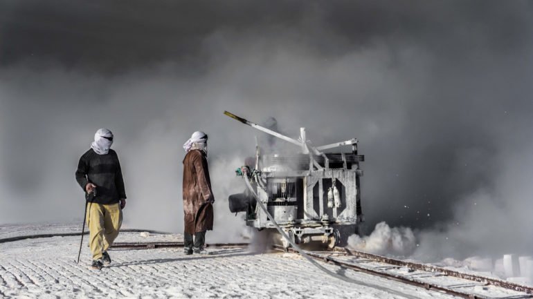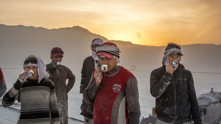 With the men wearing dusty shades and covering their faces with old pieces of clothes, smiling throughout the day, the human element in these photographs is gripping beyond understanding. The mountain dominates the backgrounds with white-colored dust everywhere; these striking colors with the artistic elements are proof of Kamal’s outsanding talent.