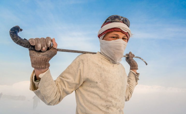 With the men wearing dusty shades and covering their faces with old pieces of clothes, smiling throughout the day, the human element in these photographs is gripping beyond understanding. The mountain dominates the backgrounds with white-colored dust everywhere; these striking colors with the artistic elements are proof of Kamal’s outsanding talent.