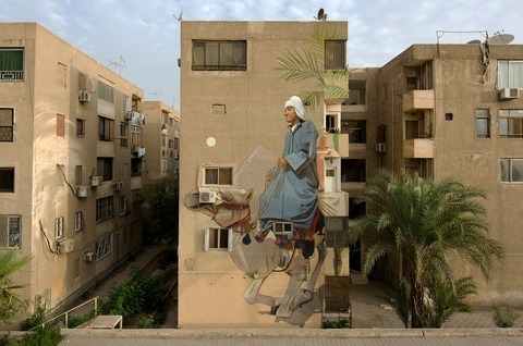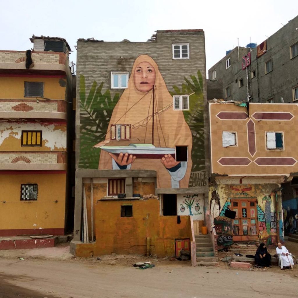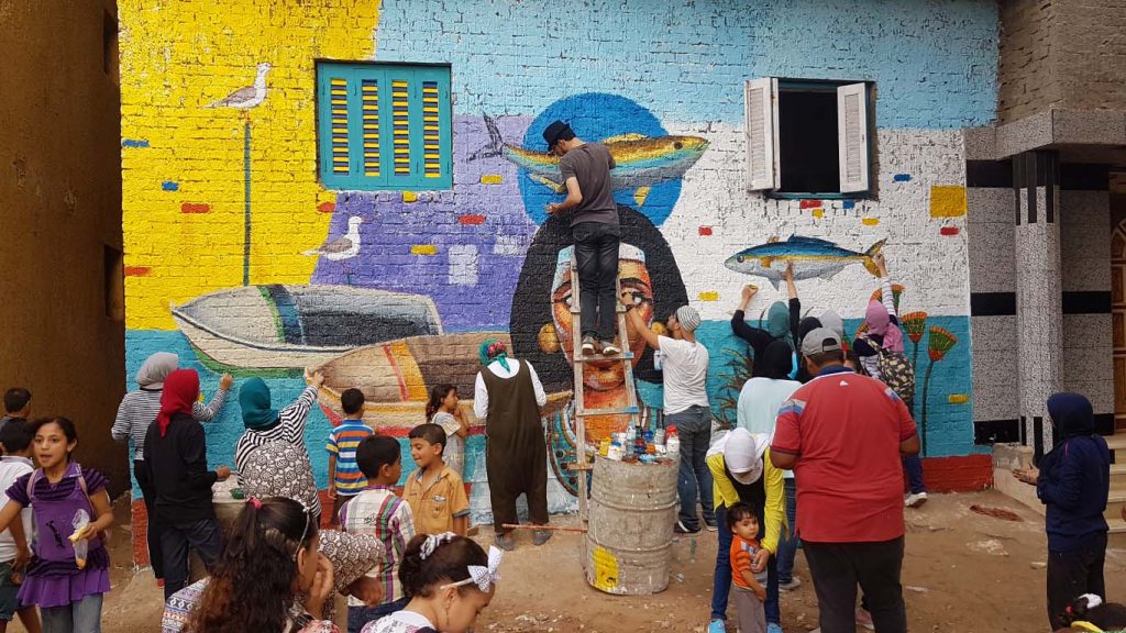 Through an annual mural painting festival called the International Burullus Symposium, artists from different parts of the world, come together to decorate the walls of homes and buildings of Burullus in Kafr el-Sheikh. While some of the murals are inspired by the town’s fishing culture, others have their own artistic themes, depending on each artist’s point of view. Some artists use their art to tackle issues facing the community’s people, such as female genital mutilation, illegal immigration, child marriage, and domestic violence.