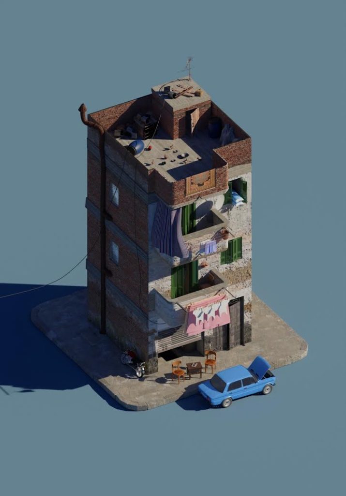 Ali draws his inspiration mainly from the streets of Egypt as he is very much influenced by culture and heritage due to the richness of culture in Egypt. As a result, Ali focuses on houses and buildings that convey the true essence of Egypt. In part, Ali likes to think of himself as an artist who is in a way preserving the culture and heritage of Egypt by utilizing them in his work.