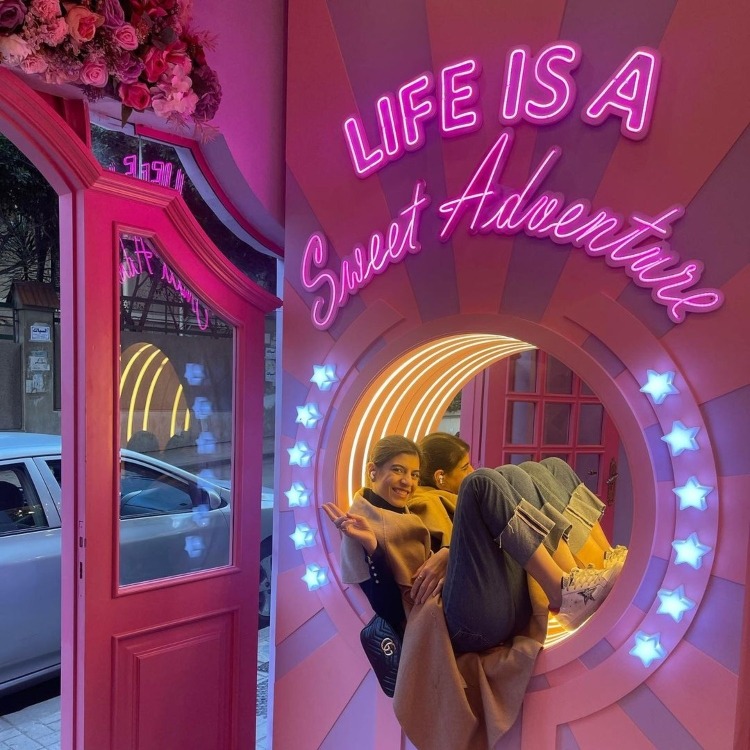 Along Kafr Abdou, the tree lined neighborhood known as Alexandria’ high-end district is a cafe that is impossible to miss. Picture this, a large pink door with an equally big pink sign that reads ‘Moullies’. On opening that door you will be entering a whimsical carnival-like space with pink neon signs as well as an entire wall of pink hearts and instagram worthy backdrops reading “can & will” and “boss lady”.