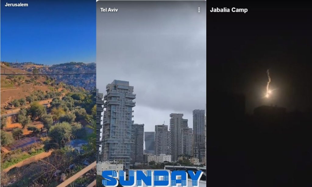 Interestingly, on the other side of the segregation wall, Israeli settlers who are also in a state of war, none of the stories featured today at the time of writing this article show any sign of destruction, killings, or random moments of fear as the ones filmed by Gazans above. The snippets from the stories below feature a contrast between an untouched view of Jerusalem, and Tel Aviv in comparison to a dark night in Jabalia camp lighted by the airstrikes in the sky.