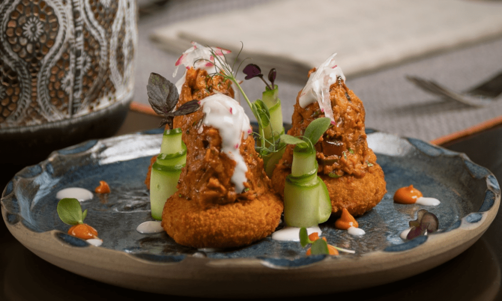 Expect everything from their slow-cooked boneless mutton smothered in tomato sauce flavored with spices, lemon, yogurt, and pickled onions and served below a crust of caramelized onion bread to a multi-layered Raj Kashor (crispy fried shells filled with everything from potatoes to lentils) covered in beetroot yogurt and a herb chutney drizzle.
