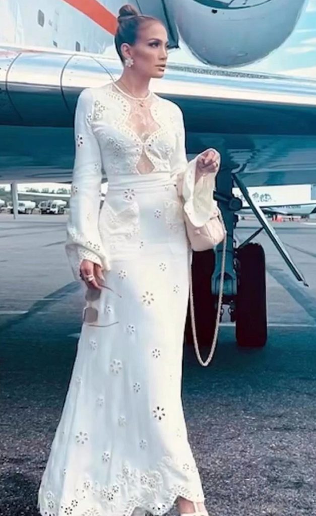 Lopez wore an angelic white dress with floral detail in addition to bold sunglasses also by the Lebanese designer with the final detail of having her hair pulled in a neat bun, giving the sleek look that much power.