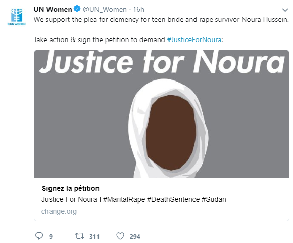 “It was a shocking moment when the judge convicted me with murder. I knew then that I would be executed, leaving my dreams unfulfilled.” Said Noura Hussein after her initial sentence! Noura is a nineteen-year-old Sudanese girl, who has been condemned to death by a court in Omdurman for stabbing her husband to death after raping her with the assistance of her family.