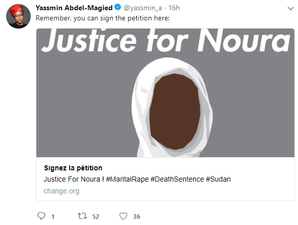 #JusticeForNoura is a movement and a viral hashtag that sparked to save the girl and to highlight the catastrophe that is marital rape. Her legal team is preparing to appeal the sentence, while online and on ground supporters are rallying in hopes to save Noura.