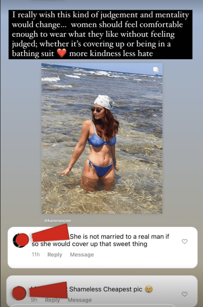 “I really wish this kind of judgment and mentality would change…women should feel comfortable enough to wear what they like without feeling judged; whether it’s covering up or being in a bathing suit,” she said on her Instagram story.