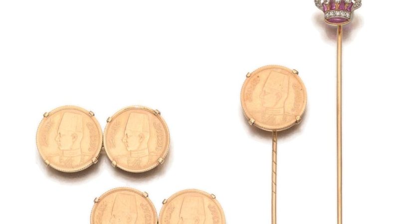 The three collections presented in the auction include a diamond purse handle, estimated to attract up to £3,500 (SAR/AED 17,186), cufflinks engraved with King Farouk’s profile, a ruby and a diamond tie pin, with an estimated sale of £220 to £350 (SAR/AED 1,080 to SAR/AED 1,718) for the collective items.