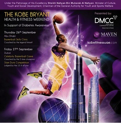 In honor of Health and Fitness weekend, Dubai Multi Commodities Centre (DMCC) has invited Bryant to coach a celebrity basketball game and host other activities in support of diabetes awareness at the state-of-art Knights Arena at the American University in Dubai this Friday, September 27, 2013. The game will then be followed by a slam dunk competition, which Bryant himself will be judging.