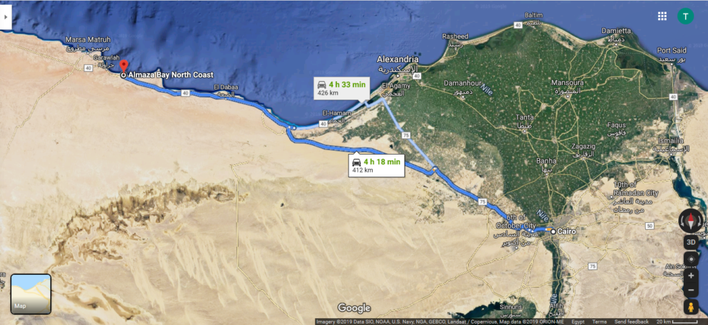 So to demonstrate, let’s take Tahrir Square in Cairo as our reference starting point, with Almaza Bay, regarded as the easternmost part of Sahel, 412 kilometres from Tahrir Square using the shortest route, as our reference destination point.