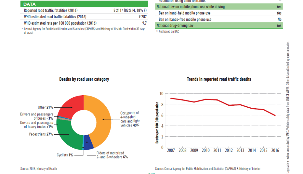 According to the World Health Organisation’s (WHO) Global Status Report on Road Safety 2018, there were an estimated 9,287 road-related deaths in Egypt in 2016, a figure which is highly likely to be an underestimation. Nevertheless, 45 percent of them were occupants of four-wheeled cars and light vehicles, making up the largest portion of those deaths. Just recently, Egypt’s Central Agency for Public Mobilisation and Statistics (CAPMAS) reported that the total cost of road accidents to the country’s economy reached EGP 28.9bn in 2017.