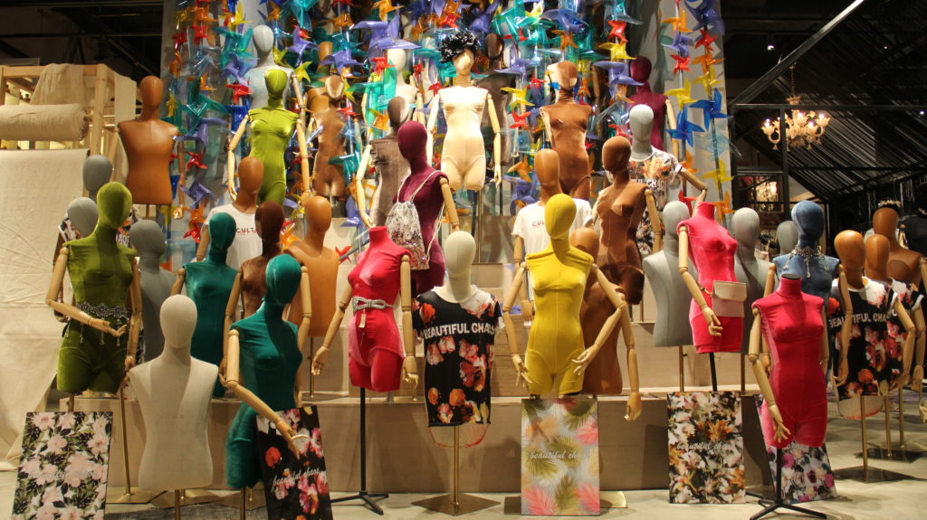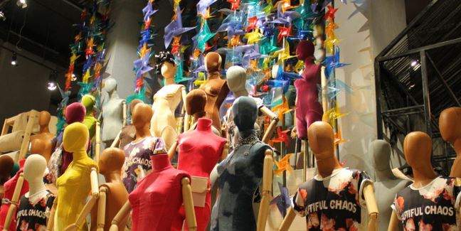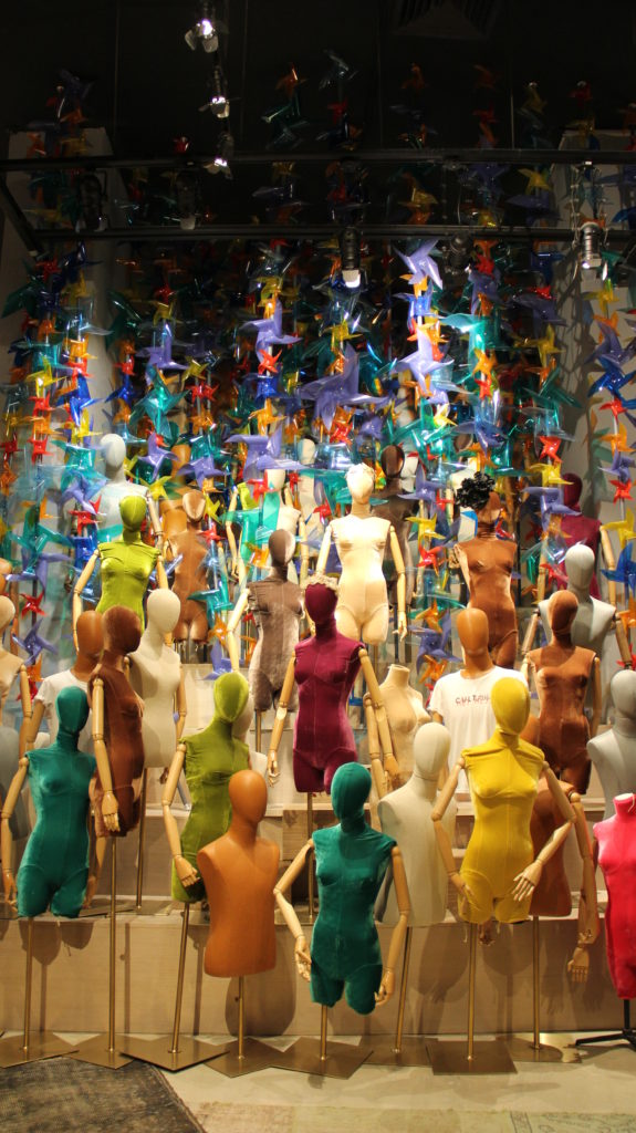 After the ‘living room’, an enormous, industrial-looking door opens onto the main showroom – here, in front of us, is a massive set of steps covered in mannequins. Usually the display shows a total of 69 mannequins, but things have been rearranged a bit to allow for the store’s current theme, Beautiful Chaos.